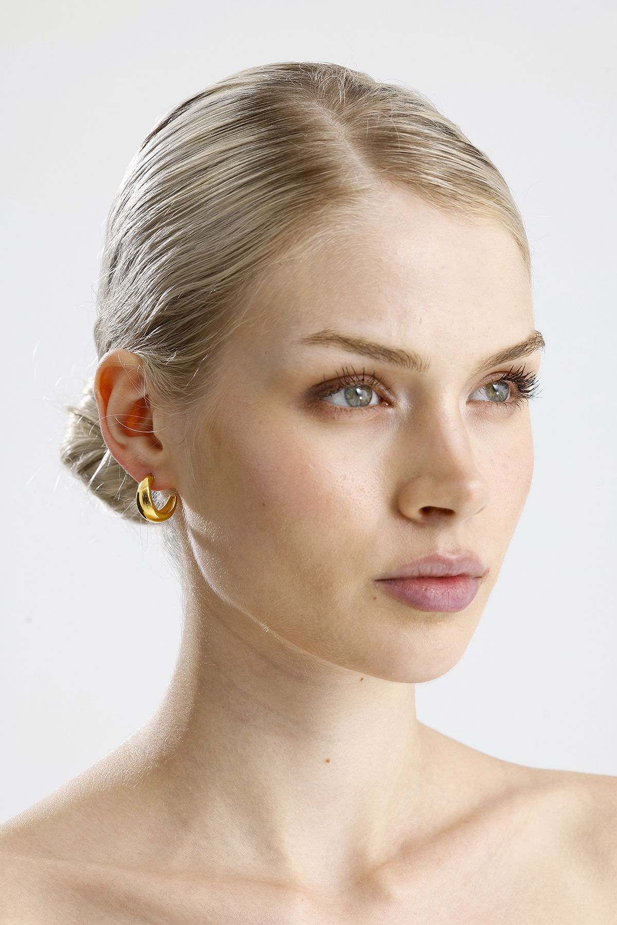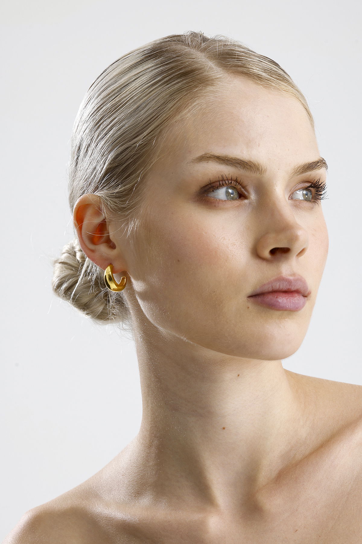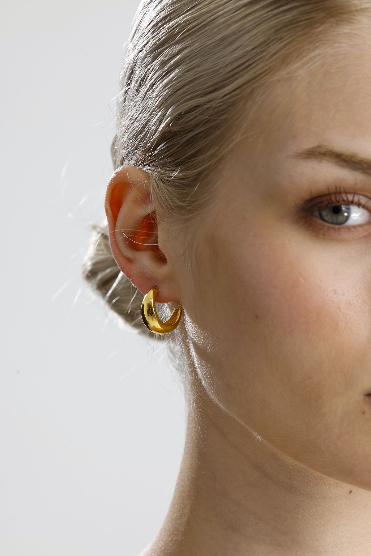 Gelince Haber VerZarif ve modern tasarımıyla öne çıkan bu küpe, yarım halka formu ve kalın hatlarıyla güçlü bir stil sunar. 925 ayar gümüş üzerine altın kaplama ile hazırlanmış olup, parlak görünümü sayesinde günlük kombinlerden özel davetlere kadar her ortamda şıklığınızı tamamlar.