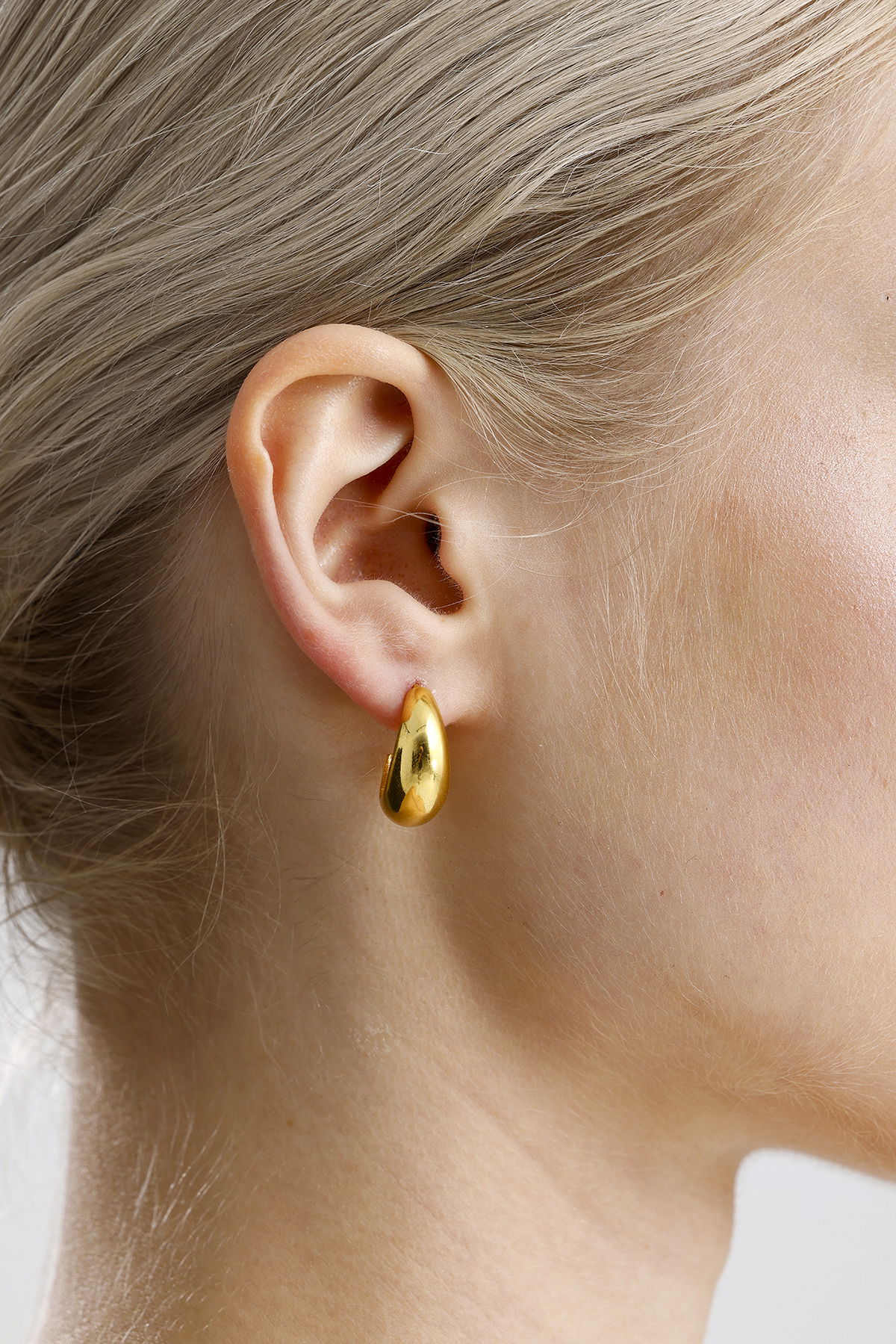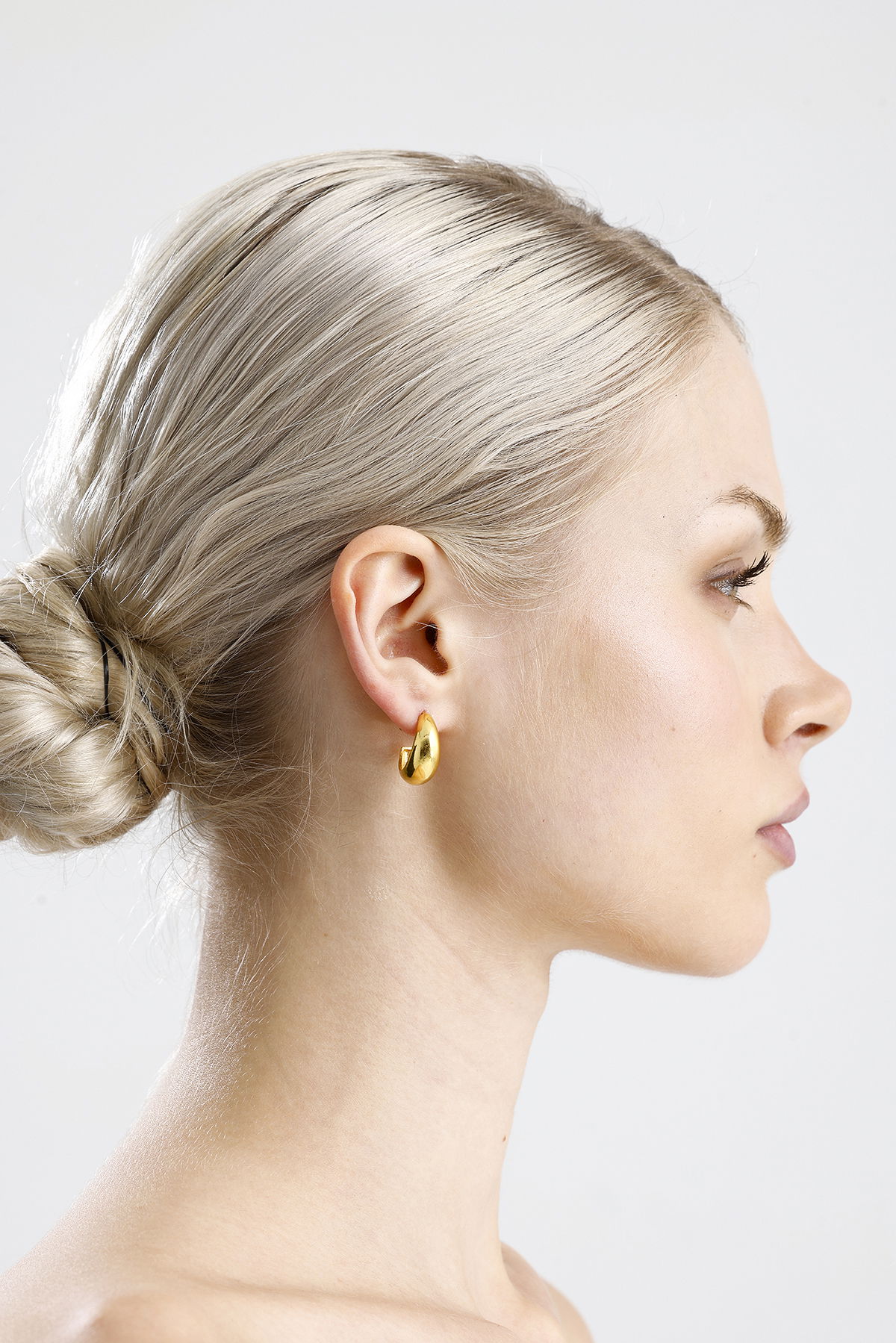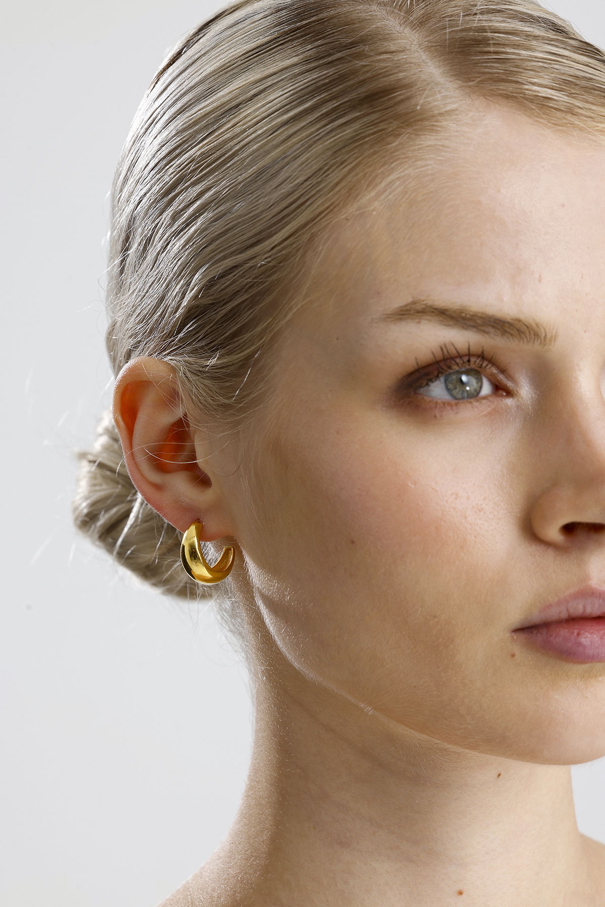 Gelince Haber VerZarif ve modern tasarımıyla öne çıkan bu küpe, yarım halka formu ve kalın hatlarıyla güçlü bir stil sunar. 925 ayar gümüş üzerine altın kaplama ile hazırlanmış olup, parlak görünümü sayesinde günlük kombinlerden özel davetlere kadar her ortamda şıklığınızı tamamlar.