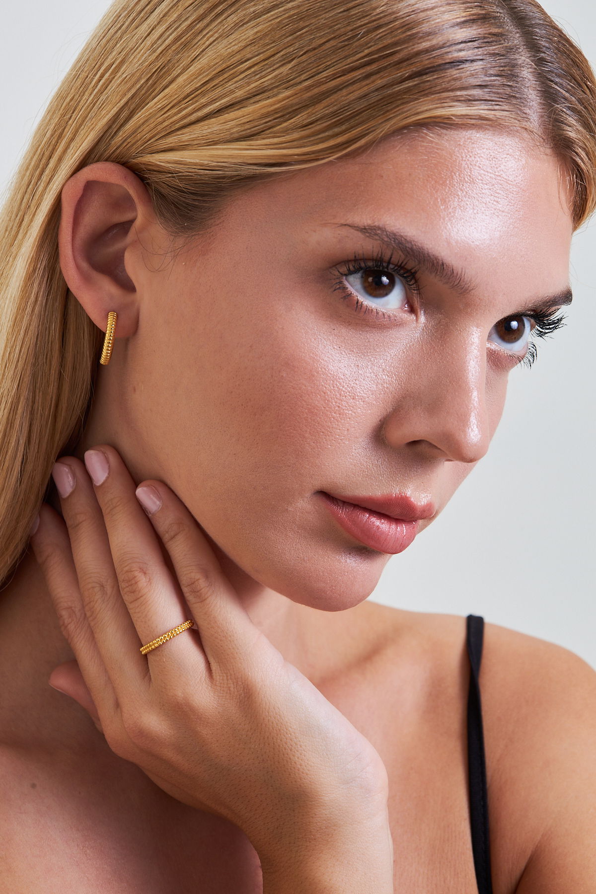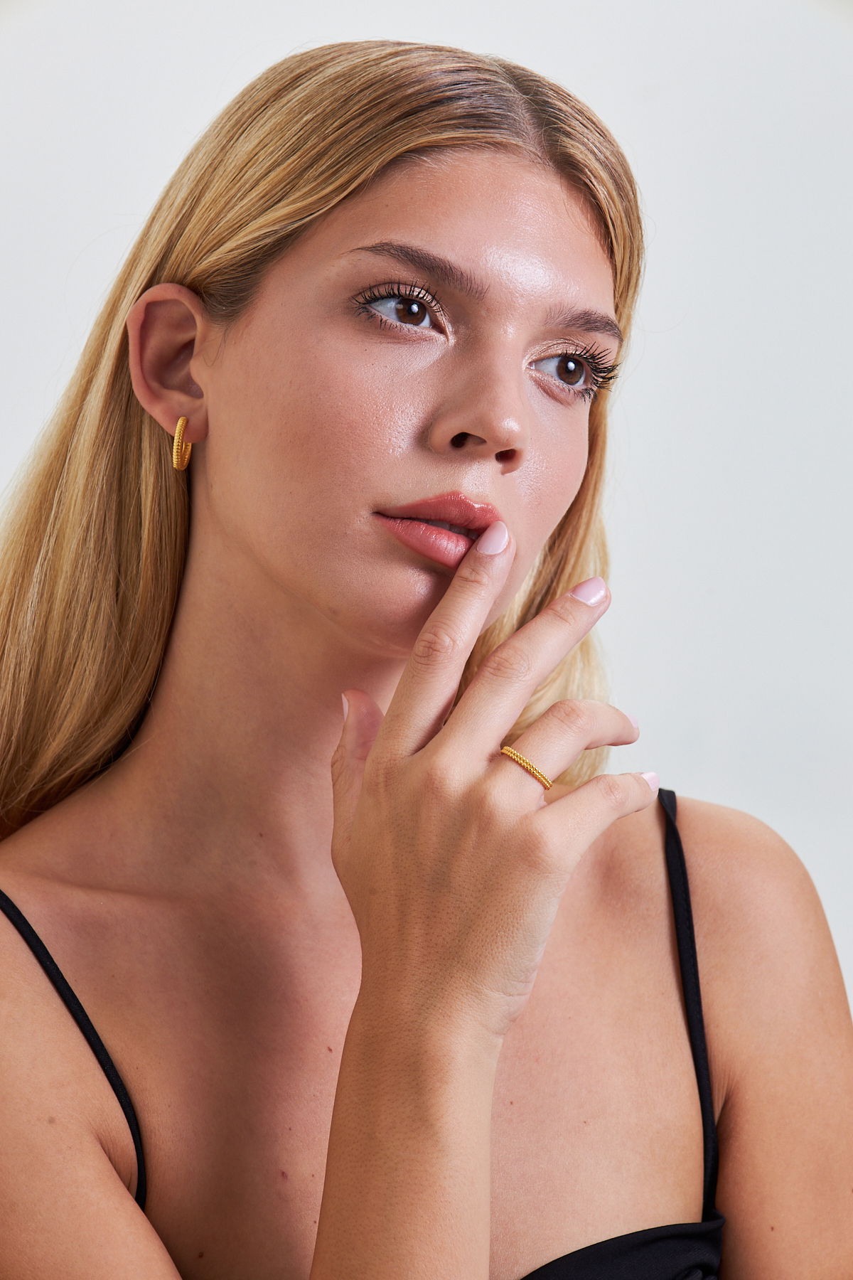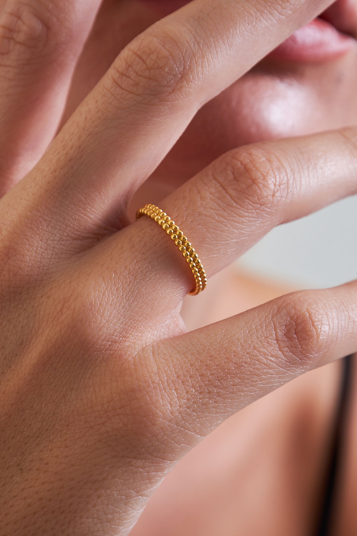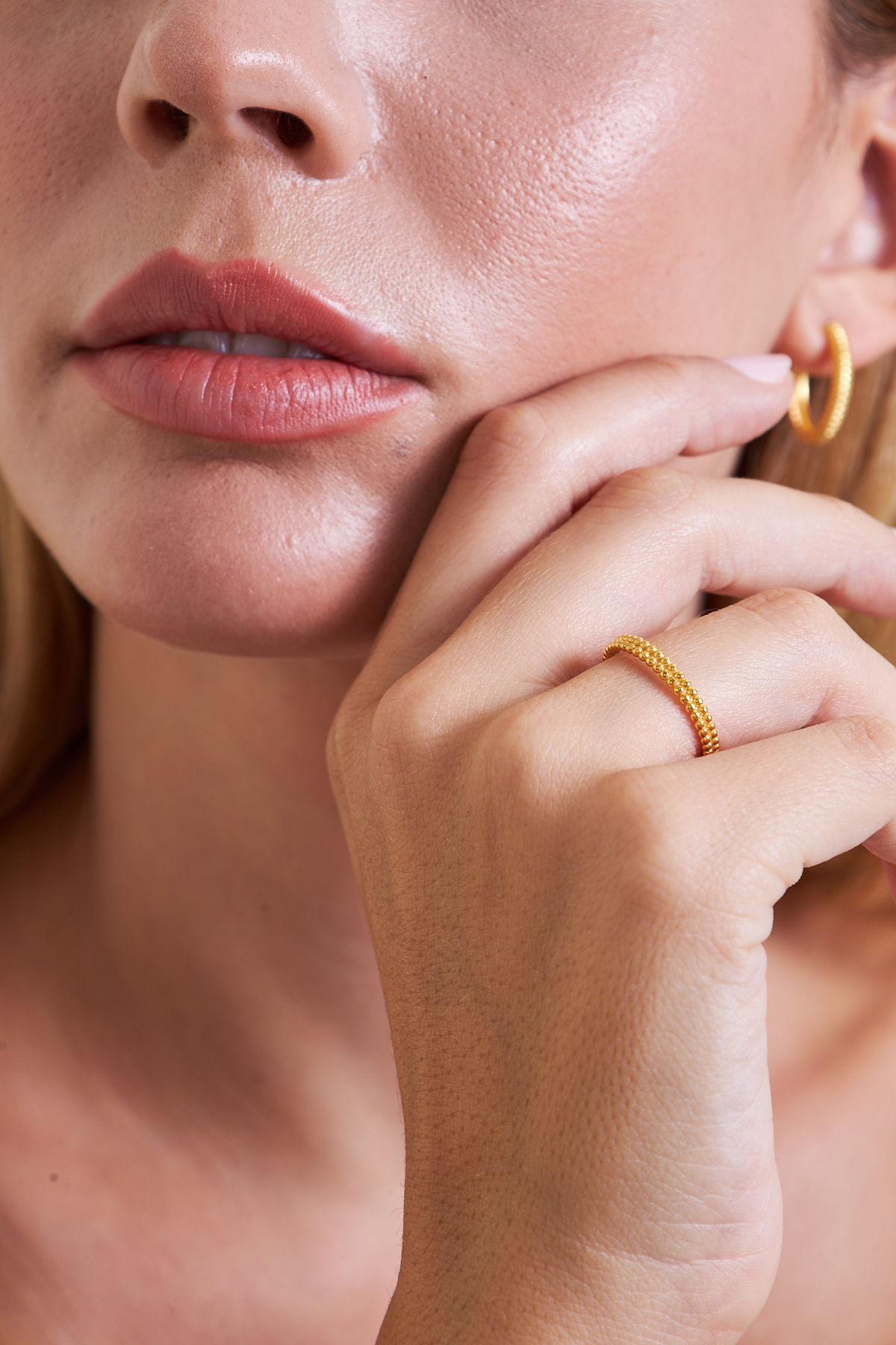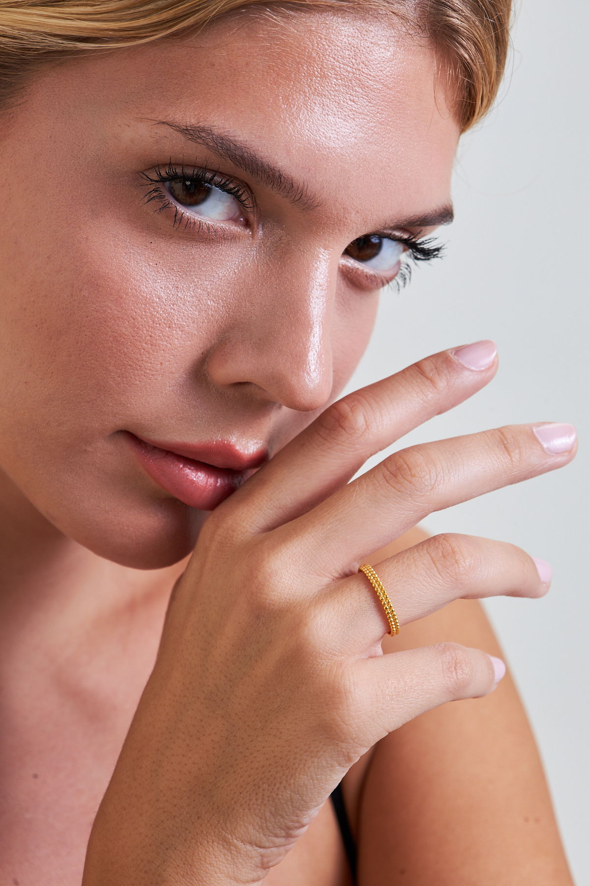 18K Altın Kaplama Sıra işlemeli 925 Ayar Gümüş Kadın Minimal Yüzük VKY-2109 - Ventino