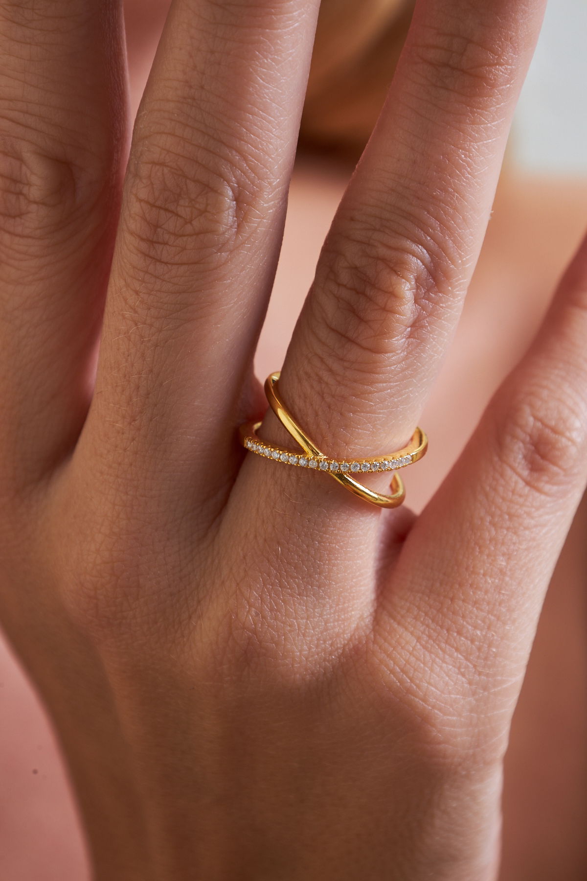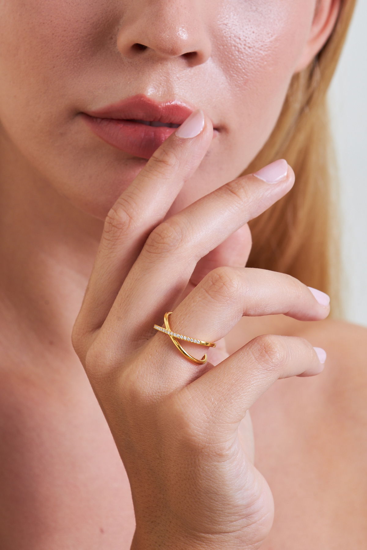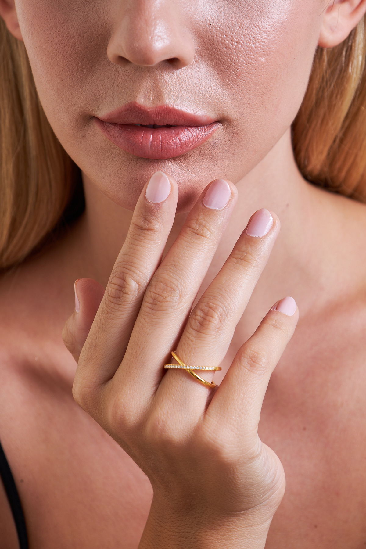 18K Altın Kaplama Taşlı Çapraz Tasarım 925 Ayar Gümüş Kadın Yüzük VKY-2120