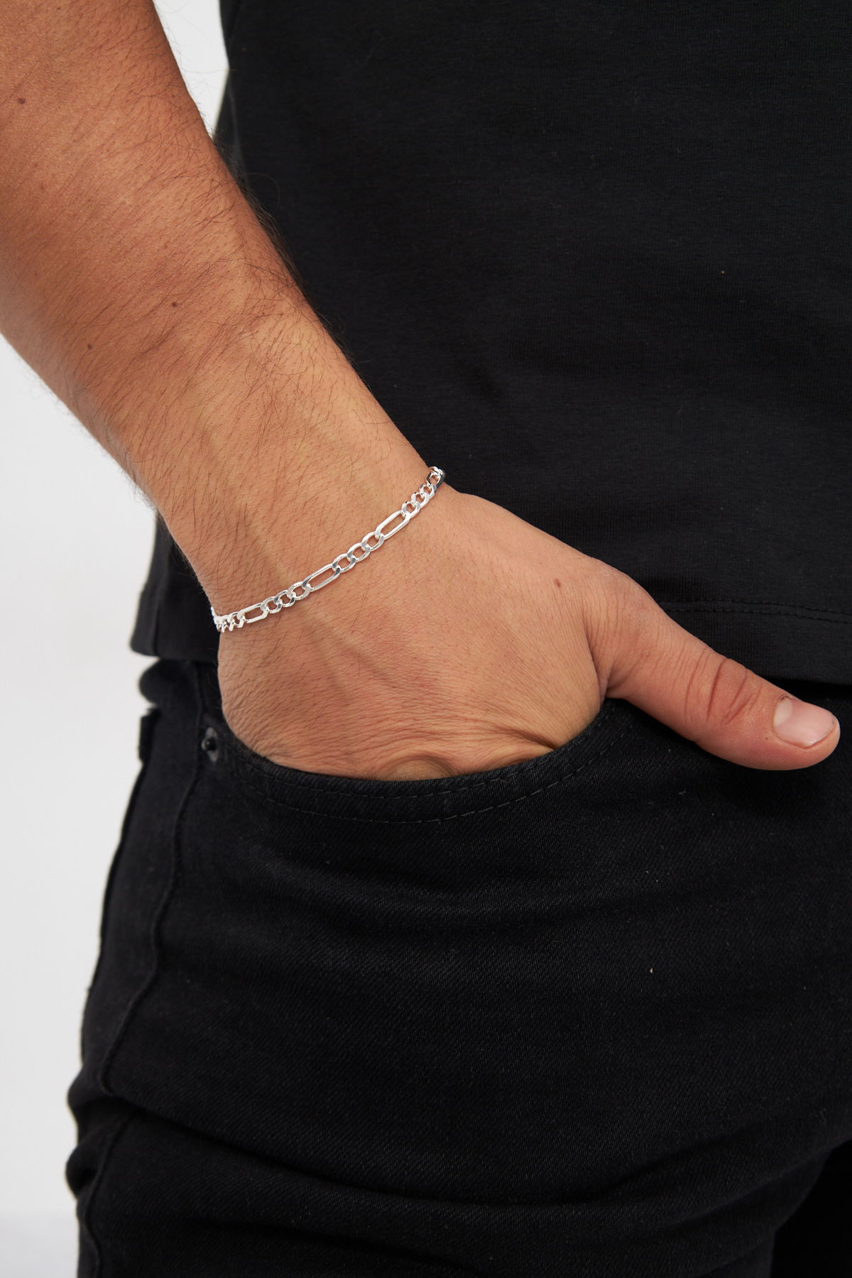 İddialı ve zarif tasarımıyla 5mm Figaro 925 ayar gümüş erkek zincir bileklik, güçlü bir stil ifadesi sunuyor. Hem şıklığı hem de dayanıklılığı bir arada barındıran bu bileklik, gümüşün doğal ışıltısıyla tarzınızı yükseltir. Modern figaro zincir deseni, her durumda kendinizi özel hissettirir.