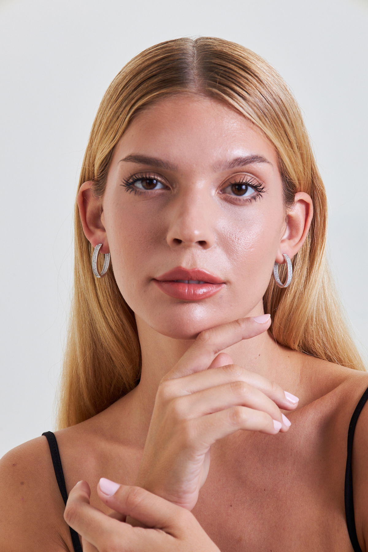925 Ayar Gümüş Çift Sıra Taşlı Kadın Oval Küpe VKP-7513 - Ventino