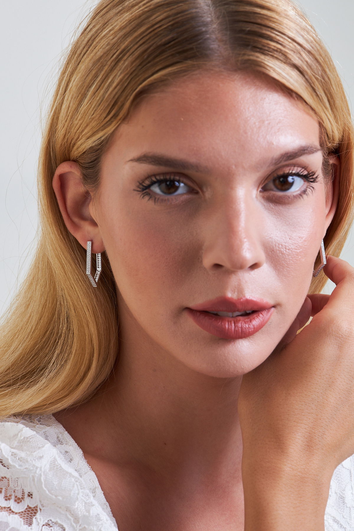 925 Ayar Gümüş V Formlu Çift Sıra Taşlı Kadın Uzun Küpe VKP-7545 - Ventino